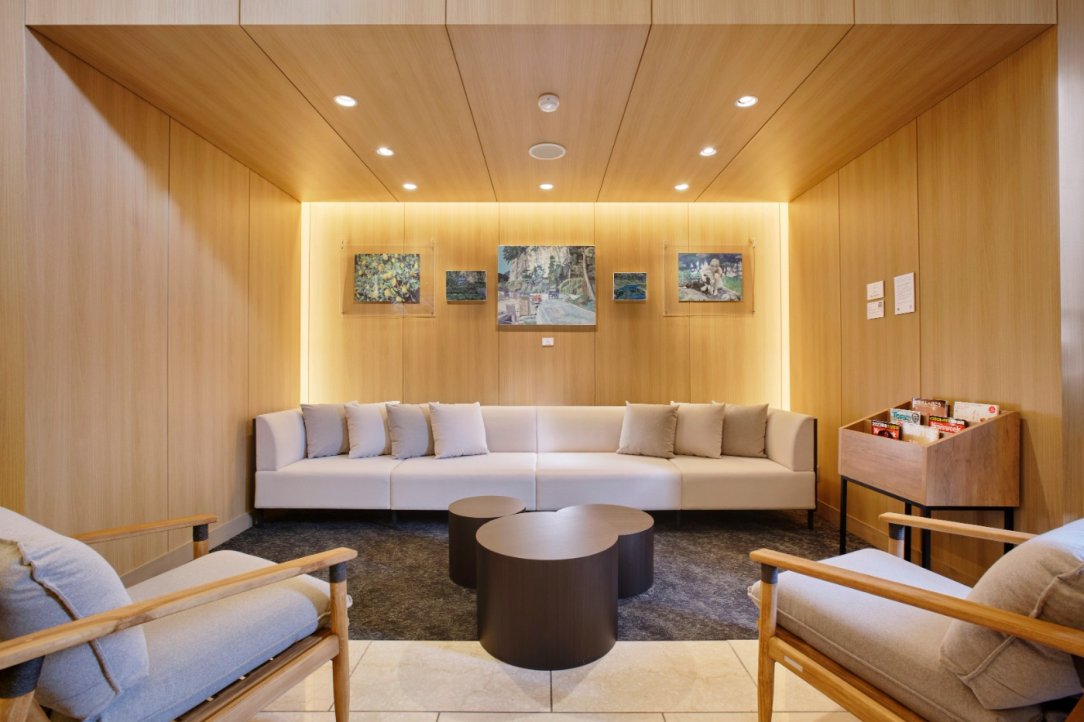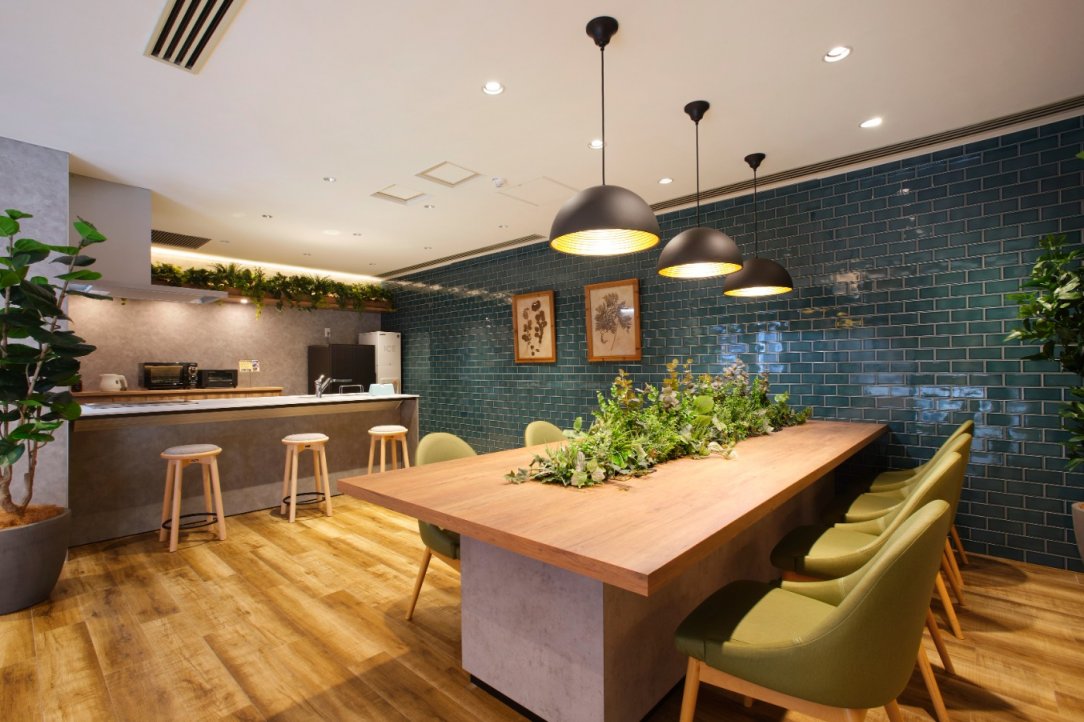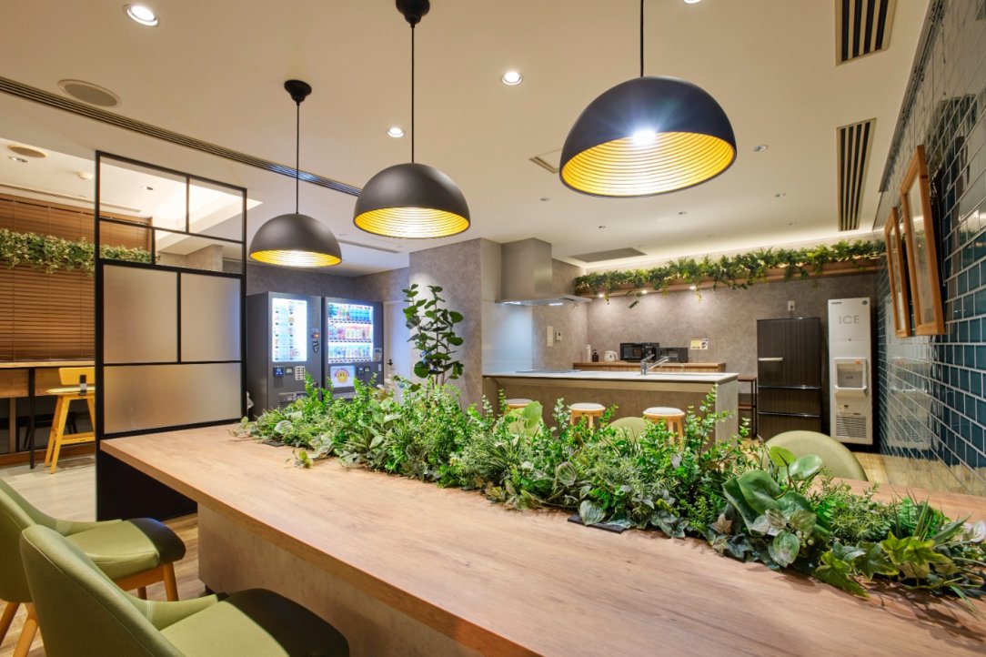 木目柄の壁面でカジュアル感を演出し、新たにゆったりと座れるソファスペースを設けた。アバターが出迎えるチェックインカウンターと壁面を柔らかな光が照らし、落ち着いたエントランス空間として刷新された。また、朝食会場奥にはシェアキッチンを新設し、壁面には凹凸感のあるアンティーク風タイルを採用。新築当初のアールデコの世界観を残しつつ、心地よい空間の創出を目指した。